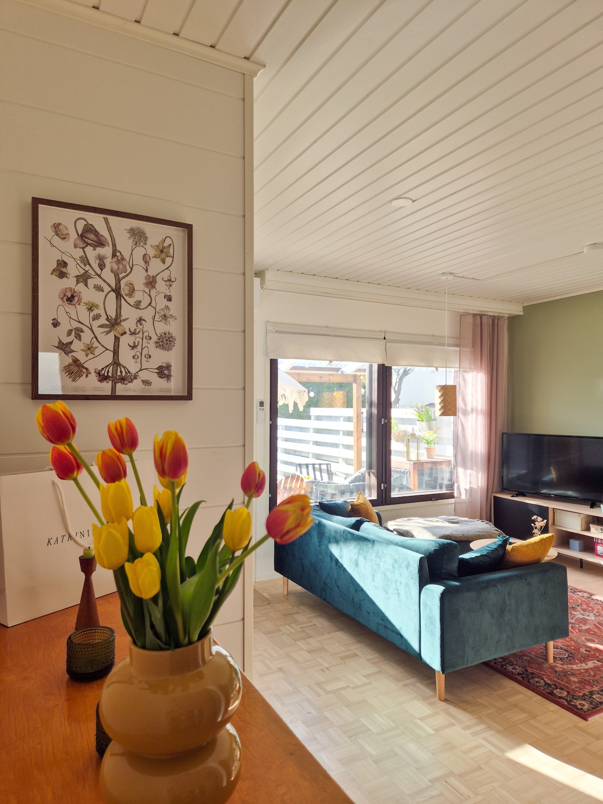 Stylish Airbnb apartment less than 10 minutes from the airport (train connection) Enjoy your vacation here in a quiet, centrally located place. The apartment has its own terrace where you can enjoy the tranquility of the area and eat your breakfast or snack from Marimekko's dishes. The bedroom has blackout curtains and hotel-quality sheets that guarantee a good night's sleep. The high-quality and versatile equipment of the kitchen allows for a comfortable evening in the apartment. Private free parking space in the yard