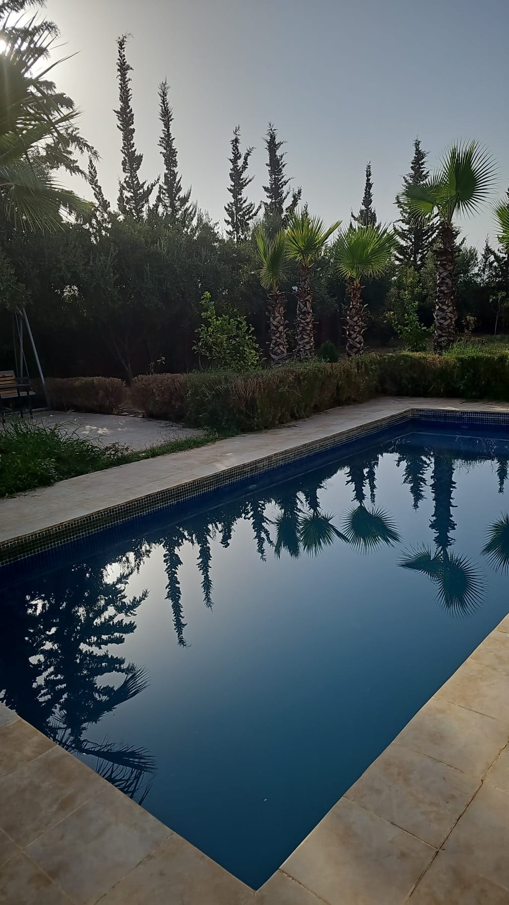 Large house with swimming pool, for gatherings with family or friends, up to 7 people. In peace and quiet. Guards on site at your disposal. There are 3 bedrooms and 3 bathrooms, a kitchen, a large indoor living area with a large fireplace and a large dining area in winter. Dining area also in the garden in summer. A large panoramic terrace from which you can see the Atlas mountain range and the sunset.