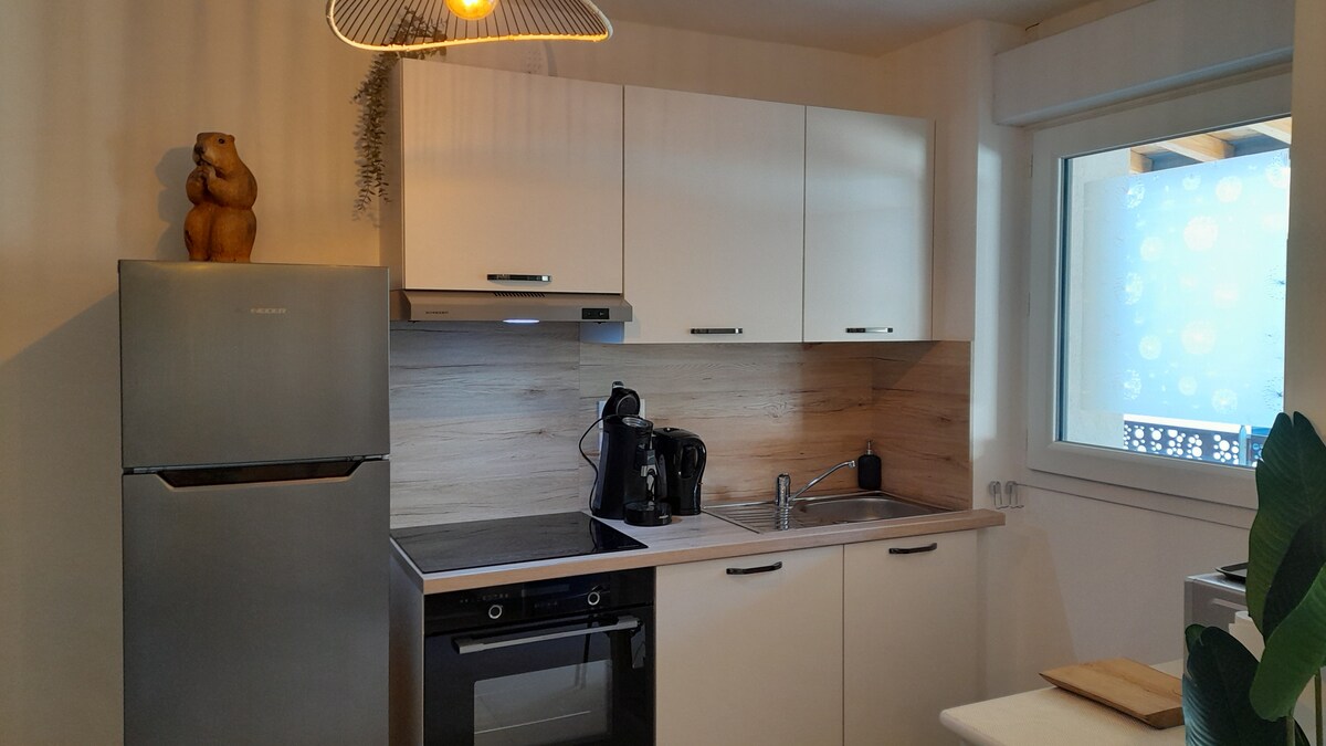 Very sunny studio with large balcony and stunning views of the mountains, close to all amenities at 300 meters (ski lifts, swimming pool, bowling, skating rink, restaurants, cinema, bars and hiking departures). Fully equipped kitchen, TV, bathroom and separate toilet, mountain corner with 2 beds, a sofa bed convertible into 2 beds. Private parking and ski locker. Bed linen provided except bath towels. Pets not allowed.