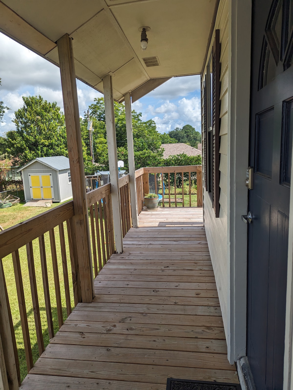Second story studio guest house located in backyard of main house. Located in a quiet neighborhood with easy access to both interstates, I-49 and I-10. Enter through the side gate and walk up the stairs to a large porch overlooking a beautiful backyard with chickens and gardens. Full kitchen with stove, microwave and refrigerator. Full bathroom with tub and shower. Queen size bed can sleep two adults.