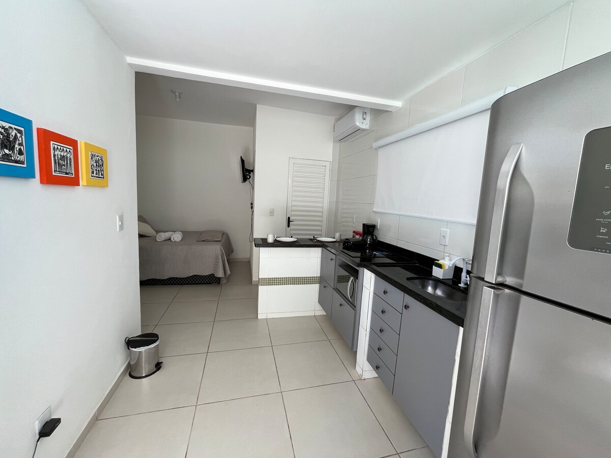 A cozy 30m² flat in the city center. It is in the Hotel with private administration. High-quality Wi-Fi inside the room. Cooktop stove, coffee maker, sandwich maker, iron. Basic kitchen utensils. You can enjoy a dry or steam sauna. Jacuzzi. Game room and a wonderful outdoor area. Hours from 9 a.m. to 10 p.m. The Hotel has a restaurant and breakfast that can be paid directly to the Hotel management. My IG @regiane.carvalhooficial
