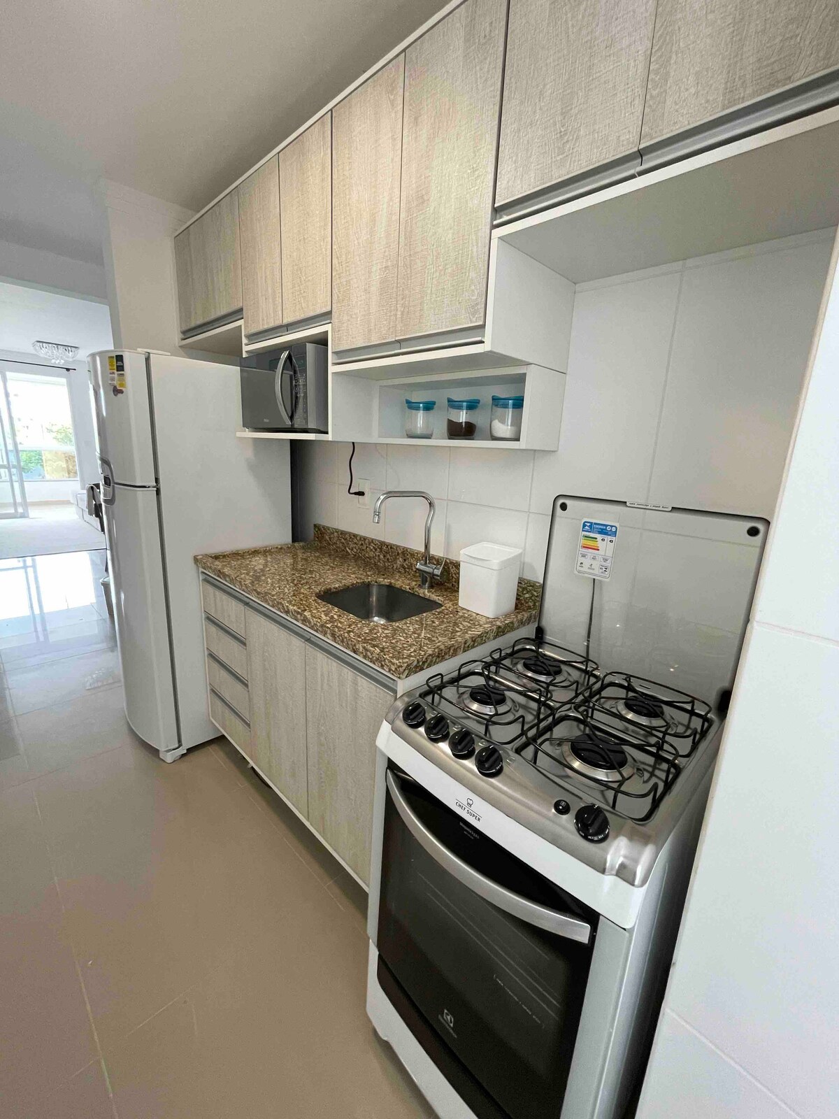 Large apartment (82m/2) with garage, air-conditioning and barbecue grill. The balcony is integrated with the living room, with a beautiful view of the beach. The kitchen is spacious, beautiful and complete. It has Wi-Fi and a countertop for a laptop. It has a large bedroom with a queen size bed, a bathroom, a toilet and a service area. Ideal for 2 people, but there are single mattresses in the living room, which can accommodate two more people. The television is in the bedroom, but can be placed on the counter in the living room.