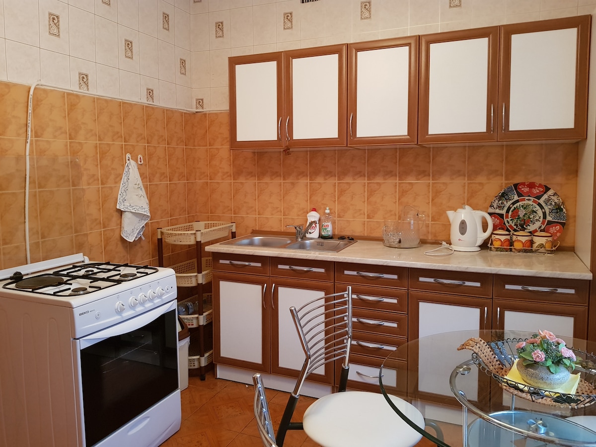 Apartment locates in 40 meters from the center of the city. There are 2 bedrooms, 1 living room, 1 kitchen and 1 bathroom. Can stay 5 people there. 24 hours water supply, Air conditioning. During booking days the apartment will be fully in your hands - it means no other guests will be in the apartment with you.