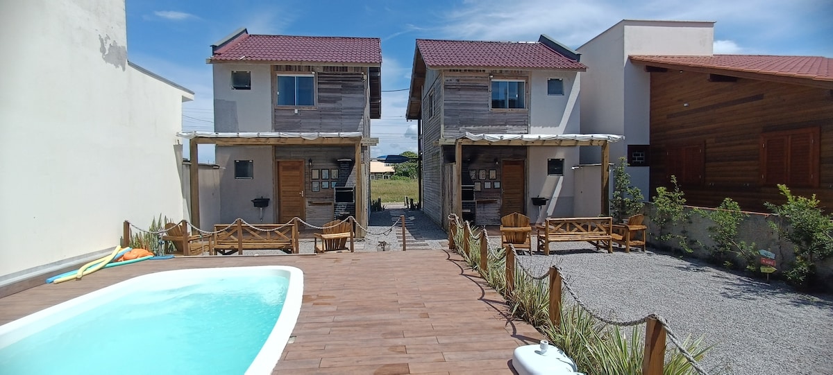 Have fun with your family in this place with a distinctive design. Detached house with shared outdoor space, accommodates up to 4 people. Swimming pool with hot tub. Complete with individual barbecue, air conditioning, electronic gate and security. It is 500 meters from the beach and 7 minutes from downtown Laguna, restaurants, bars and shops. At Praia do Sol, you will find peace, preserved nature, and crystal clear water. Come and share unforgettable moments.
