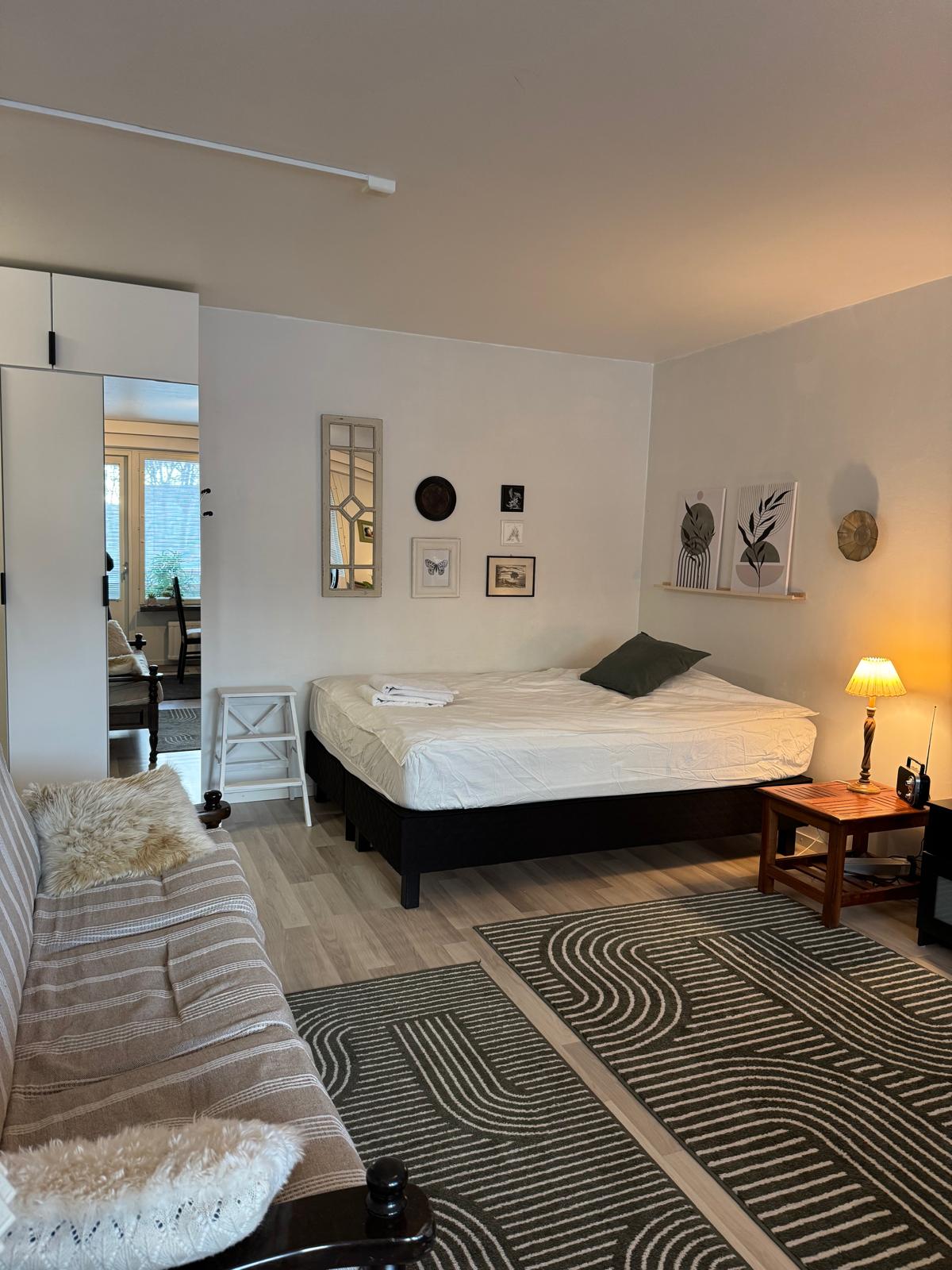 A cozy studio in a peaceful neighborhood, close to downtown Lahti. Within a 10-15 minute walk are Malva, the Travel Center, market square, sports center, harbor, and Sibelius Hall. The studio includes a living area, fully equipped kitchen, and clean bathroom. For extended stays, a washing machine is accessible outside the studio. The window faces the street with some car noise. Parking with a car heating plug is available in the courtyard. Enjoy nearby Lahti outdoor trails!