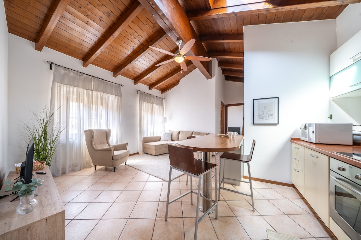 Penthouse located in the center of Colombare d/Sirmione, on the second and top floor of a small building (with elevator), large three-room apartment finely decorated, free on 4 sides, exposed wooden beams and parquet, bright, suitable for couples and families who want to spend a vacation full of fun, relaxation, sports, culture, tradition and flavors. Guests can enjoy air conditioning and underfloor heating, a double garage, large balconies, all within walking distance of the lake.