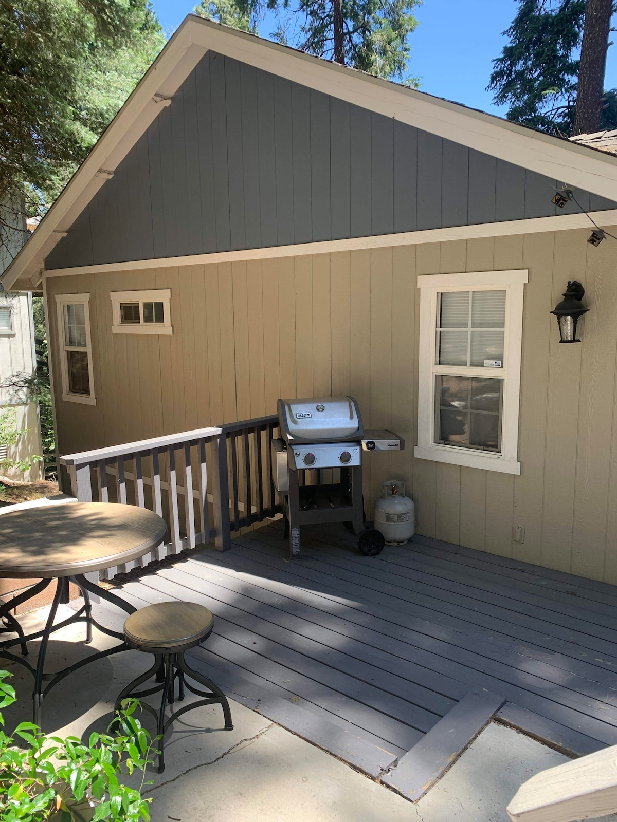 You can relax in a Peaceful Cabin with everything inside New & Comfortable! Cabin is tucked between trees in area with Running Creek. You can walk to Lake Gregory or drive to nearby Lake Arrowhead. Enjoy a Full Kitchen with Dining Table, Living Room with Roku TV, Single level, 1 Large Bedroom with King Bed, Leather Couch Sleeper & Bathroom with Marble Pebble Shower Wall. You can relax on the Front deck with lounge chairs & watch Blue Jays and Silver Squirrels. BBQ Grill & Parking for 2 cars.