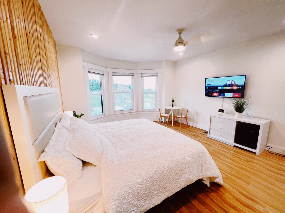 This stunning private studio rivals Baltimore’s top hotels and is packed with premium amenities most Airbnbs don’t offer. Once a mystery church set for demolition, it’s now a fully renovated mid-century modern gem with private access, a fully stocked kitchenette, new hardwood floors, and a luxe stone tile rain shower. Sleep soundly with down feather bedding, enjoy luxury toiletries, a 55” smart TV, and courtyard views through gorgeous French doors—all in a prime location with easy, free parking