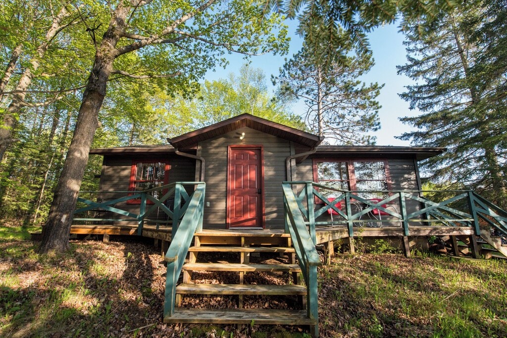 Rustic Elegance + Northwoods Flare + Island View Panorama + Fully Electric + Front Porch 10 minutes from Hayward, The Glamping Cabin's spacious semi-open floor-plan has 2 beds, full kitchen, dishes, utensils and a thoughtfully designed camp-style water system. Winter days are warm+cozy with the Row-0-Flames heater. Showers are outdoors when temperatures are above 32 degrees or next door at Loon Lake Guesthouse when its cold out. Your "toilet" is a colorful outdoor privy. Fully electric with WiFi