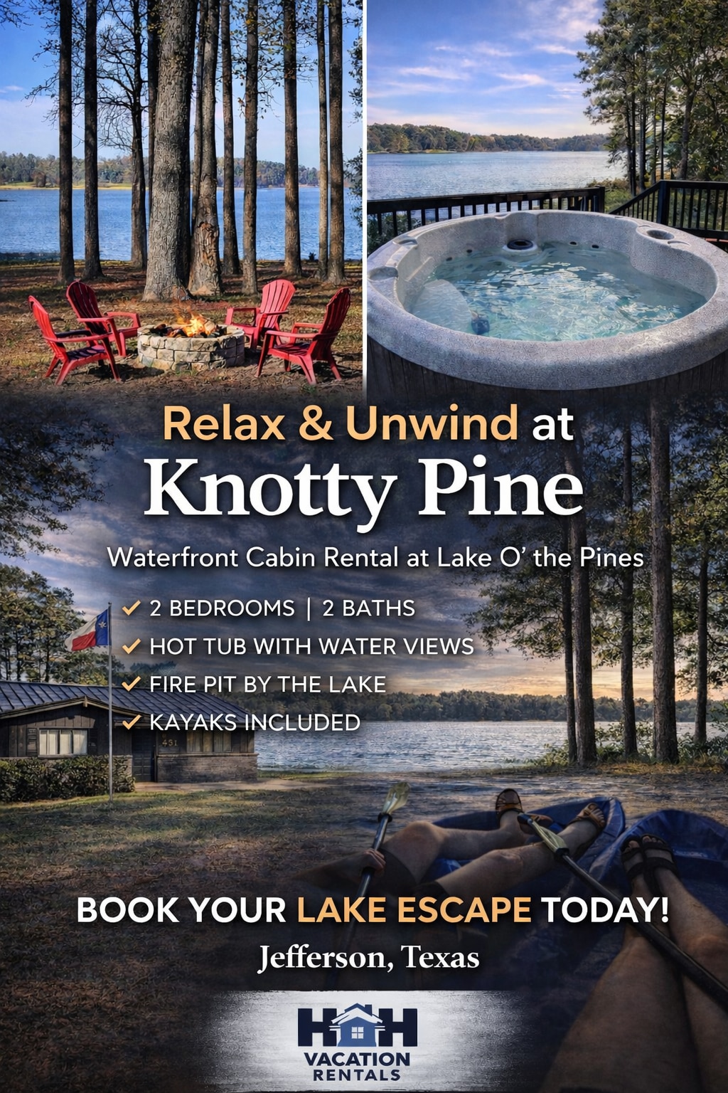 For 💲DISCOUNTS💲check out H2H VACATION RENTALS (information in additional photos) Take your next WATERFRONT LAKEcation at THE KNOTTY PINE. Located in Jefferson, Tx on Lake O the Pines South side. Whether enjoying the view, fishing, swimming, boating or just relaxing on the back porch in the HOT TUB while watching the sunset The Knotty Pine is the LAKEcation you have been looking for.