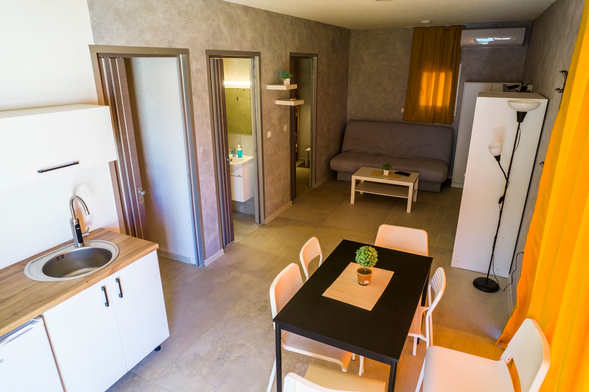 Бунгалов 51 нуди удобен и современ простор идеален за семејни одмори или престој со пријатели. Располага со целосно опремена кујна, пријатна дневна соба за релаксација, приватен тоалет со туш, комфорна спална соба и дополнителна соба со два единечни кревети. Просторот е практичен, светол и дизајниран за пријатен престој во природна околина, нудејќи совршен баланс меѓу удобност и функционалност.