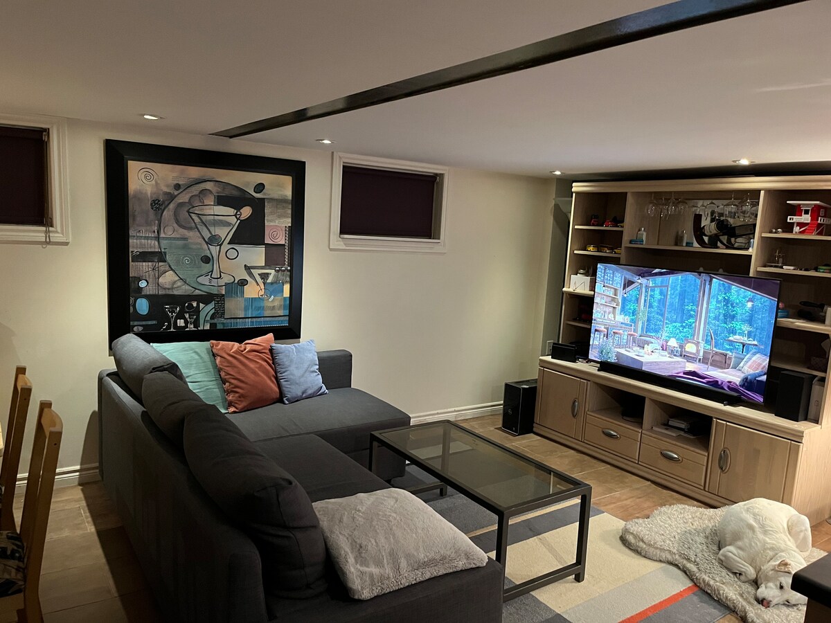 Welcome to New Toronto! Driveway parking included next to entrance. Large -Cozy basement apartment in lakeshore village, Lake Ontario is at the end of the street. Beautiful skyline view of downtown Toronto , Full kitchen with stove and oven. Large dining room table. Comfortable L- shaped couch. One bedroom with queen size bed. Washer , dryer, laundry facility. WiFi Netflix, Prime video, Book a month or longer stays , bring your pet.