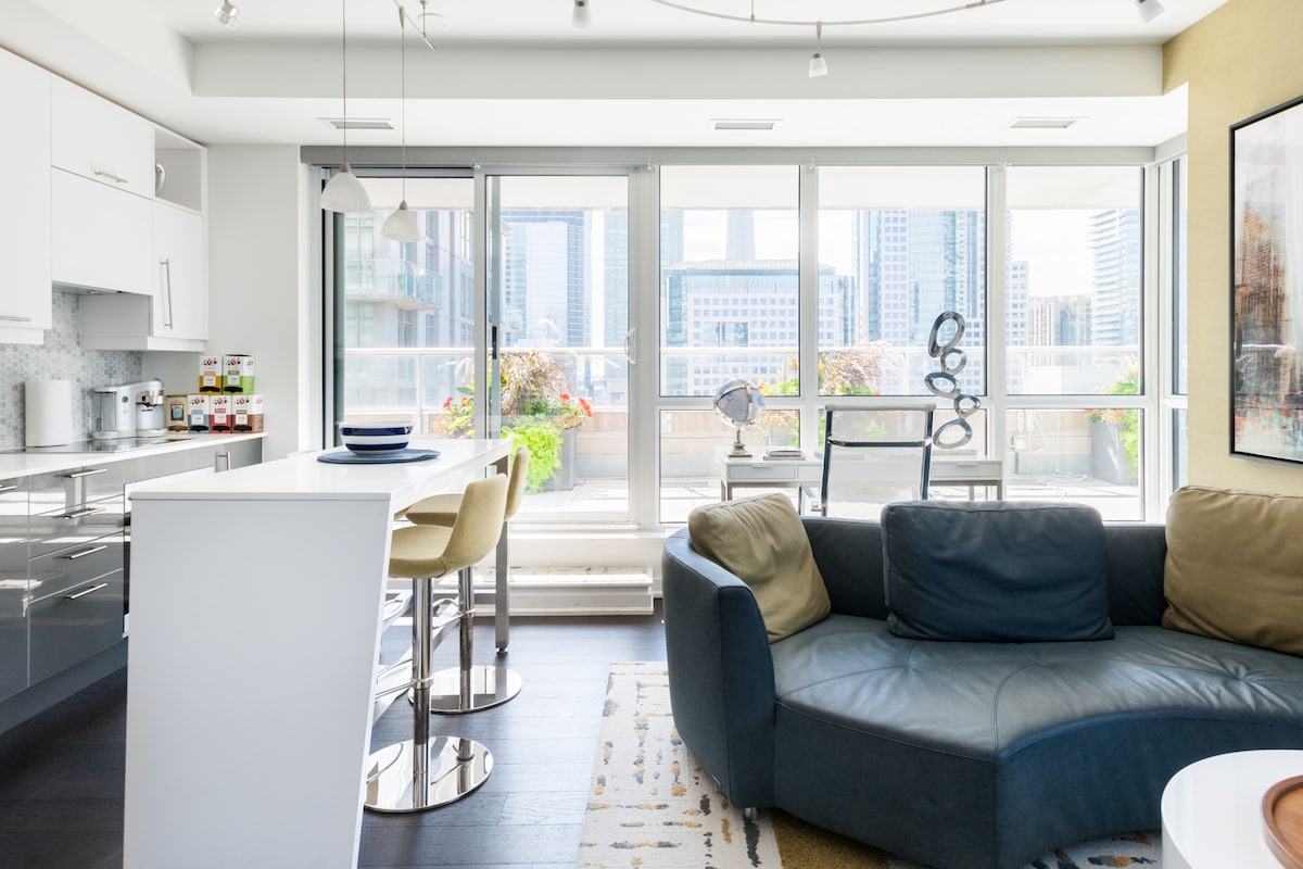 Relax amid the latest high-end furniture from Roche Bobois and Jardin de Ville, even a coffee table designed by Lenny Kravitz. The 1,000 square foot terrace boasts a 270-degree view of Toronto. Guests have access to hot tubs, a gym, sauna, and more. NOTE: Amenities (including the gym) in the building are temporarily closed due to COVID-19. The condo is furnished with high end furniture from Roche Bobois and Jardin De Ville... there's even a coffee table designed by Lenny Kravitz. Smart TV's everywhere and Sonos Sound system for indoor and outdoor listening pleasure. Our 1000 Square Foot terrace is very unique for a downtown location. You have a 270 degree view of the downtown and is a perfect entertainment spot. It's great for sun bathing and some pre-dinner drinks and conversation. Come have a great time in a safe and secure building with 24 hour concierge and security. There are 2 private bedrooms with queen size hotel style beds + available roll-away bed for groups of 5 people. 2 full bathrooms with all toiletries provided. The Kitchen comes fully equipped with all cooking utensils and pots and pans. If you're a coffee lover, you're really going to enjoy the coffee selection that is provided. Note: We have a spectacular sister property right next door, which boasts 3 bedrooms, plus a roll-away bed if needed, plus another 1000 square foot terrace. The 2 terraces are connected and will be accessible for large groups. The 2 condos hold a total of 12 people. Guests are allowed to use all amenities in the building. Amenities include the outdoor space on the 6th floor, which has hot tubs, many lounge areas, BBQ's and sun decks. The gym is also on the 6th floor along with the mens/womens change rooms, saunas/showers, a tv lounge and quiet sitting areas. You will need to bring your keys/fobs to gain access to the common areas. I live 5 minutes away from the building and almost always greet guests upon their arrival to show them around and take them up to the suite. I am readily available if guests need anything such as extra towels, supplies or even suggestions on where to go for dinner. Note: If for some reason I cannot meet and greet you upon your arrival, I will send you the lock-box instructions. The western end of Queen (sometimes simply referred to as "Queen West") is now best known as a centre for Canadian broadcasting, music, fashion, performance, and visual arts. Over the past 25 years, it's become a major Toronto tourist attraction. Public transit is closeby... streetcars on Queen Street and King Street, plus the Osgoode Subway station is just a short 2 minute walk. Both Union Station (train) and The Bus Terminal are just a 10 minute walk, Billy Bishop (Island Airport) is 10 minute taxi ride away and Pearson Airport can be reached by taxi or by the UP express train from Union Station. Please adhere to the following; NO loud music NO parties NO narcotics NO smoking indoors (balcony only) Please be respectful of your surroundings and the neighbours. The majority of the people who live in the building are full-time residents who go to work and don't want to have to deal with excessive noise and problems. Let's all make the AIRBNB experience a positive one!