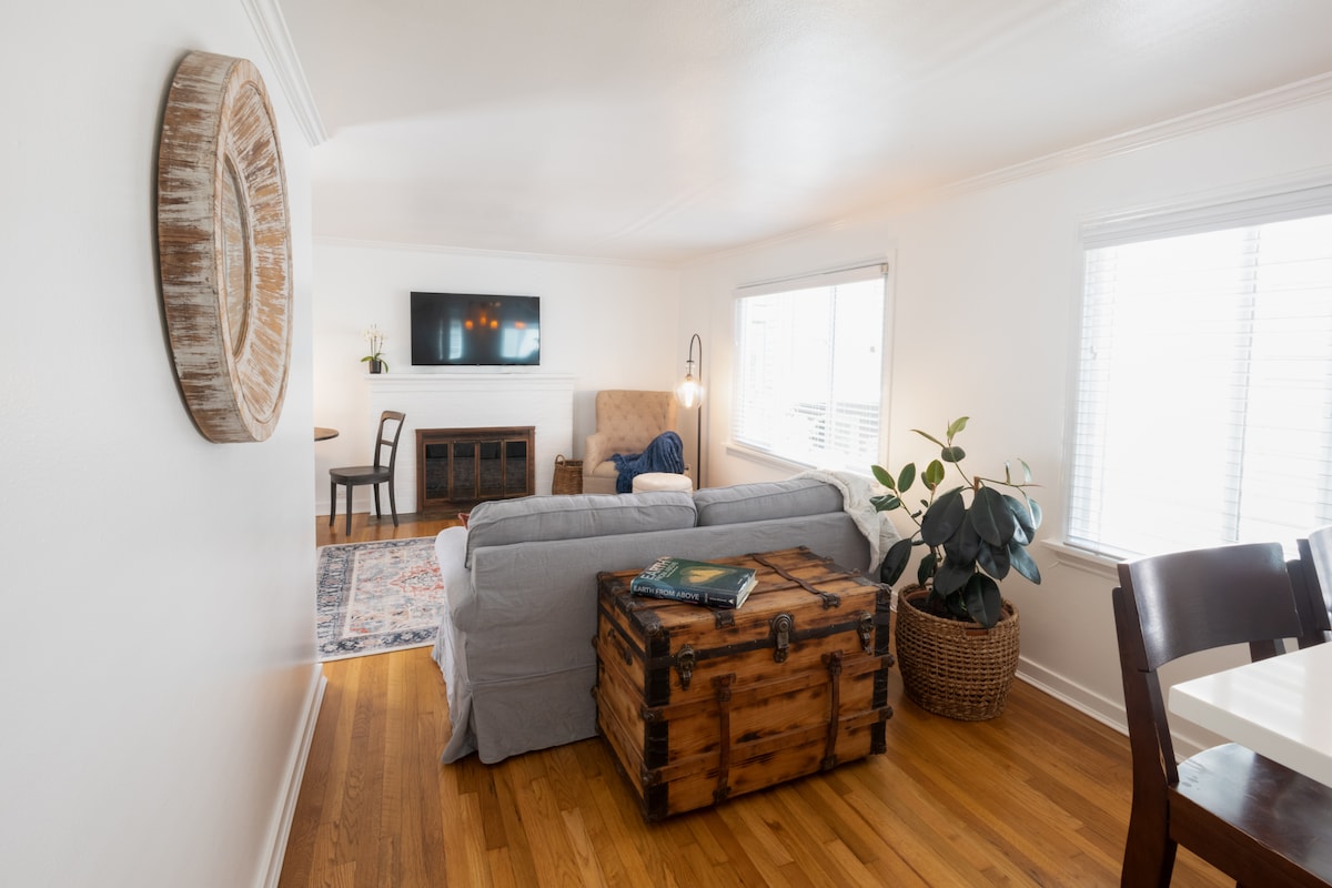 Huge private top floor 1 bedroom/den apartment from homeβs side stairs. 950 sq ft newly remodeled on historic landmark street. Top of hillβ¦ 2 LEVEL walking blocks to 40+ restaurants, bars, retail, grocers. Decorated with curated art, cookβs kitchen, den with daybed, laundry, expansive view balcony. Vaulted ceilings/sunny rooms. New Casper mattress, luxury Brooklinen sheets. Fast WiFi, Samsung TV/Bose soundbar with cable/streaming. N.W. travel library. AC! 2 buses 2 blocks. Free Parking