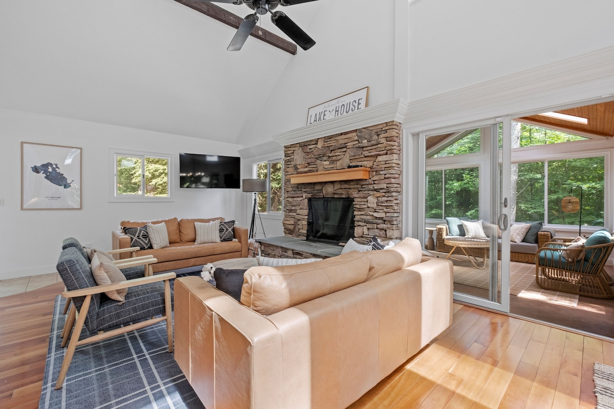 Escape to a peaceful, lakeside retreat with a secluded sun-lit deck and private dock with incredible views of Sunrise Lake, plus a 4-person hot tub, and seasonal amenities like a pedal boat, two kayaks, a SUP board, gas fire table, central A/C, a pellet stove, and snowshoes. Enjoy nearby activities like hiking, leaf peeping, skiing, and visiting scenic towns, local vineyards and breweries — or simply relaxing in a beautiful lakefront setting. The sunsets can be unbelievable!