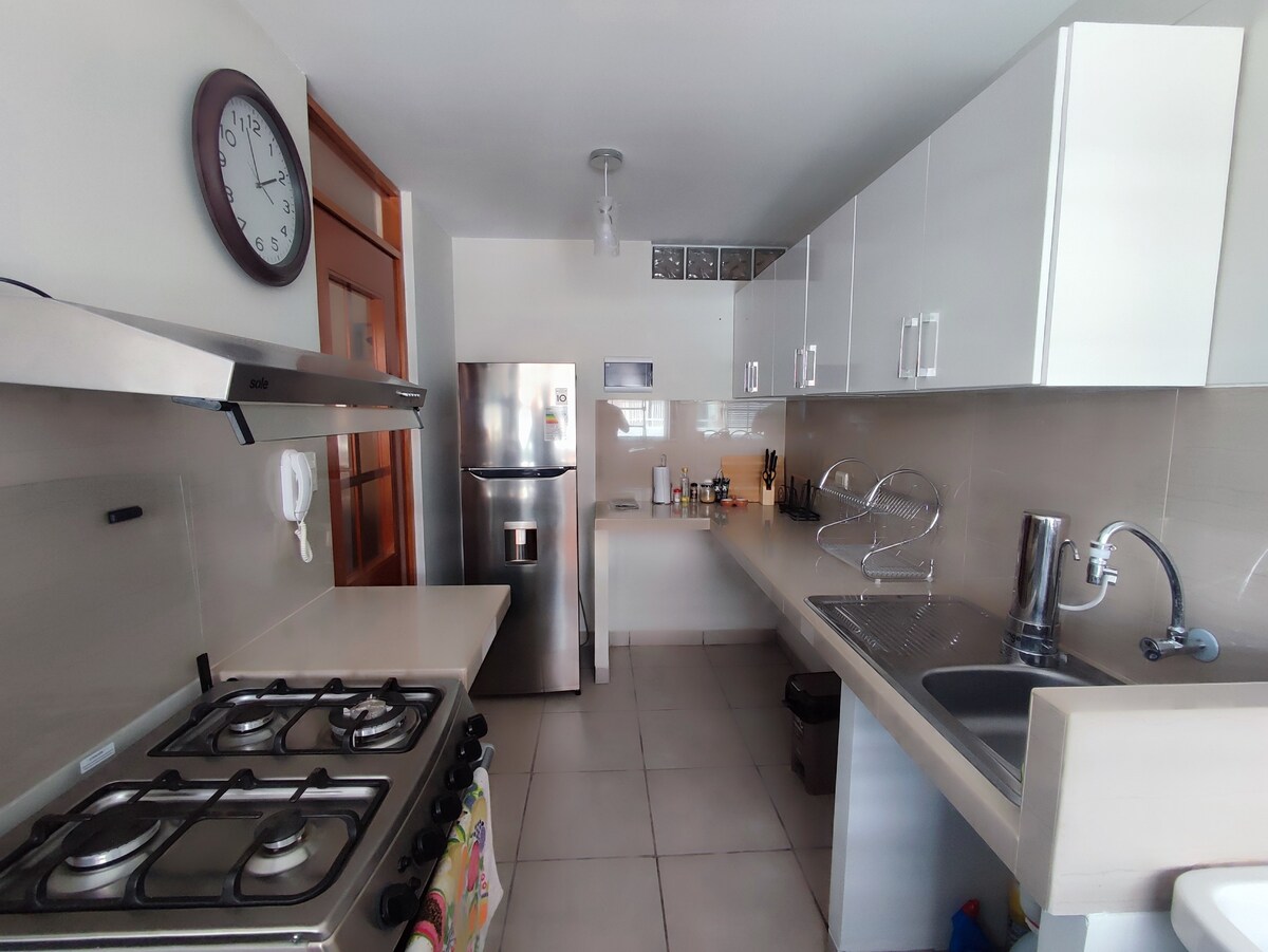 Welcome to your peaceful home in Chiclayo! This stylish first-floor apartment is quiet and secure. Enjoy filtered water, fast internet, smart tv w/ local channels and Netflix, hot showers, A/C, and modern extras like a dishwasher, clothes washer, dryer, and microwave. The building has 24/7 guarded access, and there are no stairs to climb — perfect for families, seniors, or anyone who values comfort and convenience. You’ll feel relaxed, safe, and right at home from the moment you arrive.