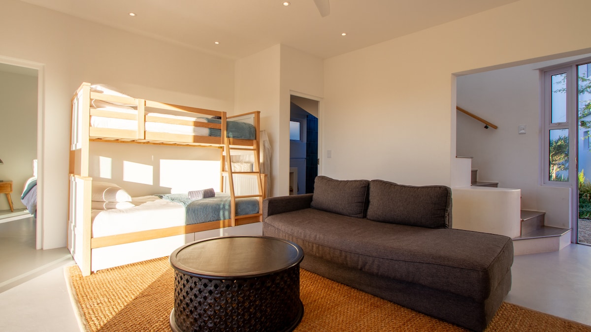 Highline boasts uninterrupted ocean views & magical West coast sunsets. Big glass doors open onto a deck, with a private gate leading to a quiet beach. It is designed for indoor-outdoor living and is perfect for family stays or romantic getaways. The house can accommodate 6 adults (3 bedrooms) and 6 kids (3 bunk-beds). Strictly no additional adults in bunk beds!
