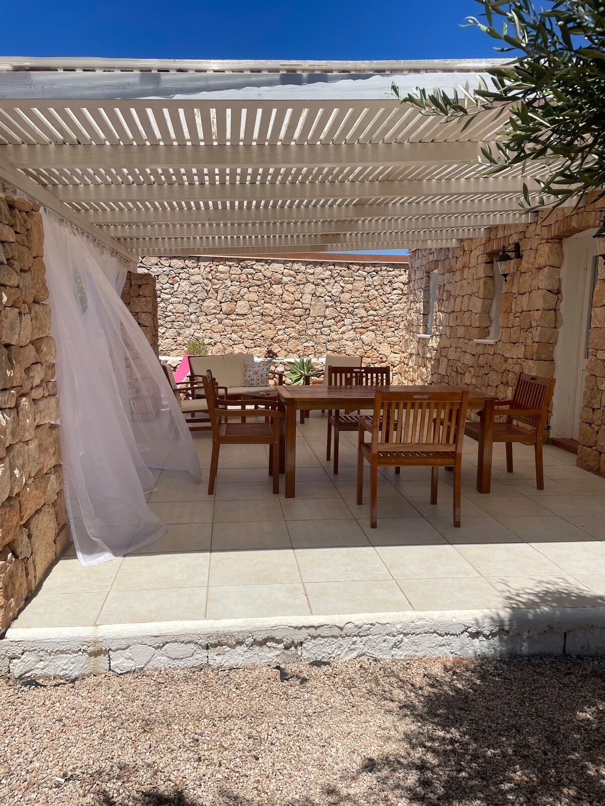 The dammuso is located in Piddu, about 600 meters from the beaches of Cala Madonna, Portunt'oni, Cala Croce, 1 km from the center and Guitgia beach, 3 km from the island of rabbits. It is located in a quiet area away from the chaos of the village. It consists of: independent entrance, 1 bedroom, 1 bathroom with shower, 1 kitchen, 1 veranda equipped with table and chairs, barbecue, sun loungers, garden and private parking.