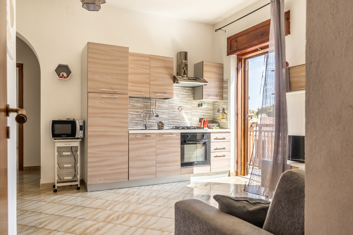 New apartment with two bedrooms, bathroom, kitchen, living room and terrace with panoramic view. Located on a quiet street near the main street, Via Roma, characteristic in the evening for the walk between shops, bazaar, within walking distance. Nearby bars, restaurants, food, bus stop. In a few minutes you can reach the beaches. Air conditioning, bed linen, kitchen, bathroom, hairdryer, wifi, washing machine, transfer on arrival and departure included.