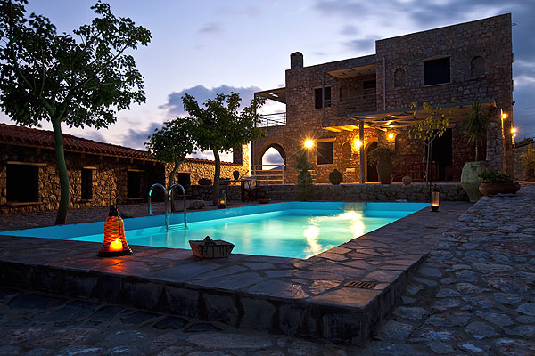 A fully renovated, stonebuilt compound built on top of three ancient greek grottos. It used to be a Venetian olive press factory. Now it's a contemporary holiday home with two pools (indoor and outdoor) and an organic vegetable and local fruit garden
