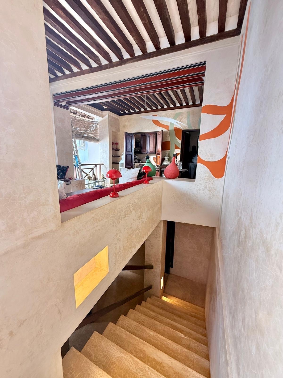 DAR EL EDEN HOUSE is an old 18th century swahili house carefully restaured and expanded in 2009 This coral stone house maintains its original swahili architecture with local traditional materials and tadelakt plaster technique used in Marocco. Original 3,5 m ceilings and walls are decorated with carved niches , freezes and alcoves . The 4 levels home with swimming pool ,5 bedrooms suiting up for 12 persons includes a 360 degrees panoramic view on the city and ocean on third floor.