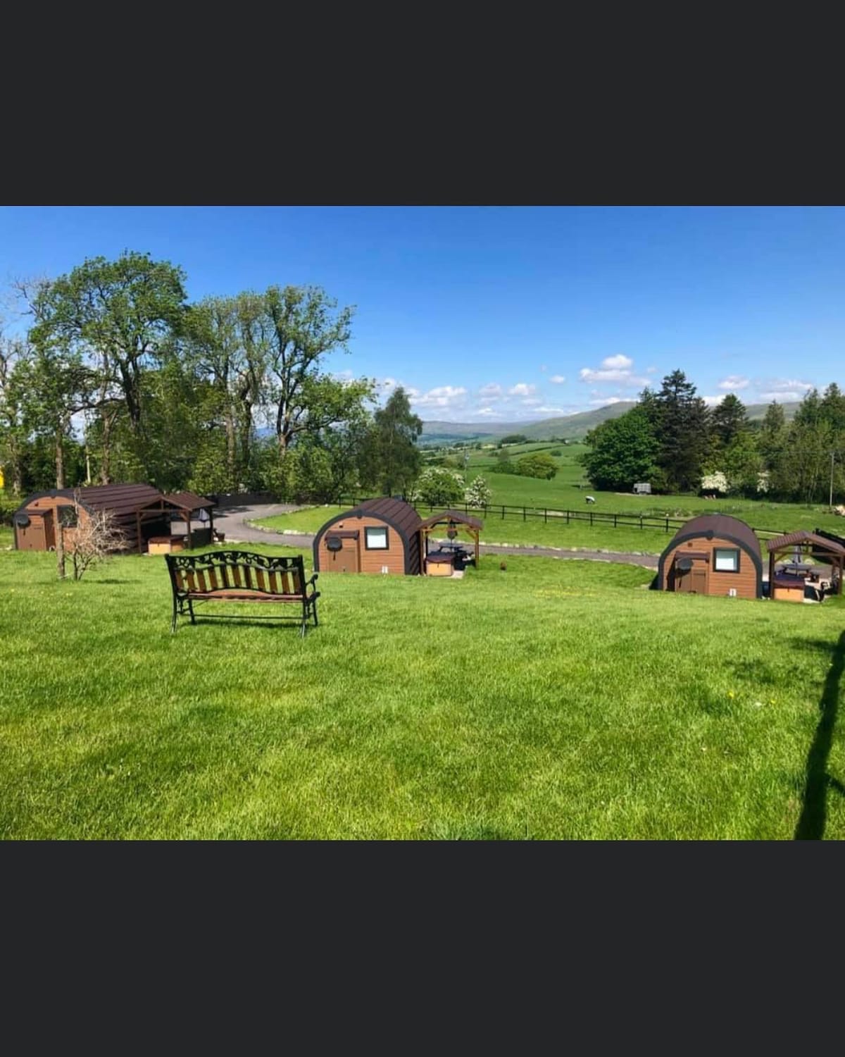 Set in a beautiful south Lake District near kendal and 30 minutes from Windermere . The pods overlook the stunning views of the Howgill fells with mountain valley views,just a few 100 yards from our working farm.Expect to see farm animals.All pods come with their own private hot tub. Sleep up to 4 people.Full central heating.Dog friendly🐶 Fully equipped and with Hob,microwave,fridge freezer. Pods are next to the dalesway walk route. And 5 minutes from Lambrigg fell. Come and relax and unwind😊