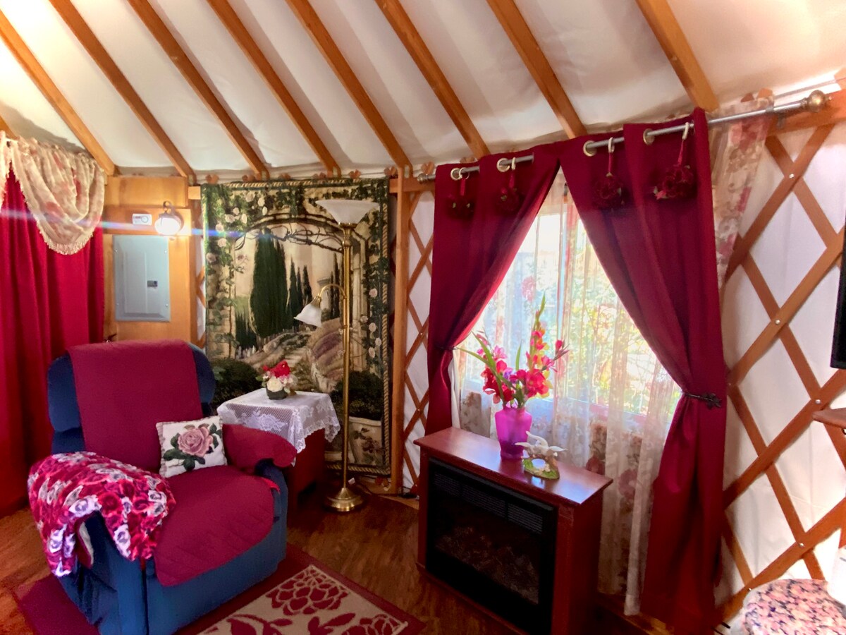 Mystical Rose is uniquely themed, red or terra cota exterior yurt. It is 24' in diameter with cool A/C and warm heat from it's own heat pump. Enjoy a complimentary selection of coffee and self-serve breakfast items. It is close to restaurants, great wineries near by and tasting rooms all with views etc. You’ll love my place because of the Yurts are themed, to quote several people "WOW". I am part of Yurtel-Veneta, a 3 Yurt bed and breakfast.