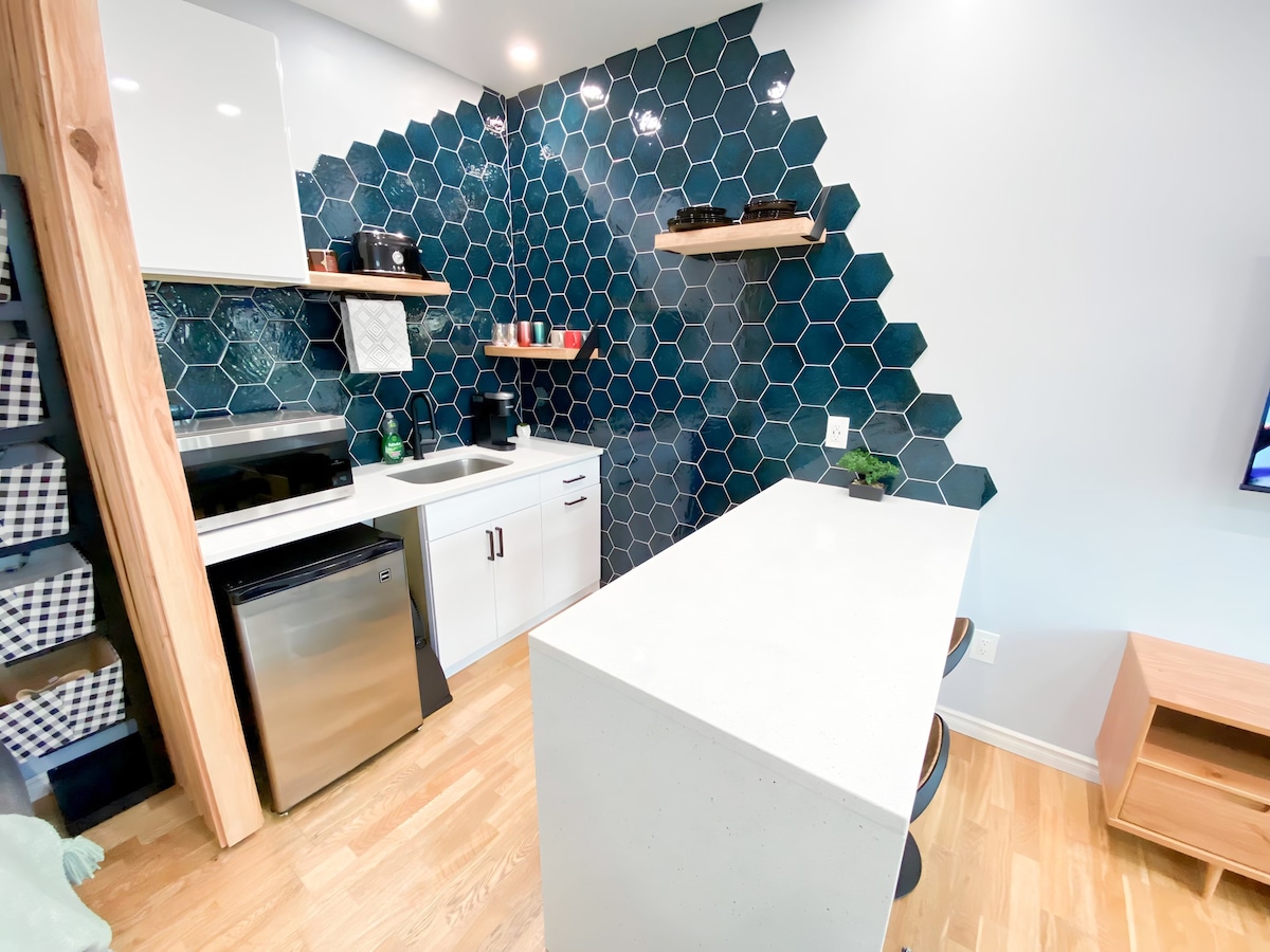 Welcome to our luxurious studio suite in a bustling area of town. With immediate access to transit, shopping, and restaurants, it's the perfect location for exploring the city. The suite features a stylish design, a fully equipped kitchenette, and a full bathroom with a luxurious shower tower. Ideal for solo travelers or couples, our space offers comfort and convenience for your stay. Enjoy the vibrant city life and all the amenities at your fingertips.