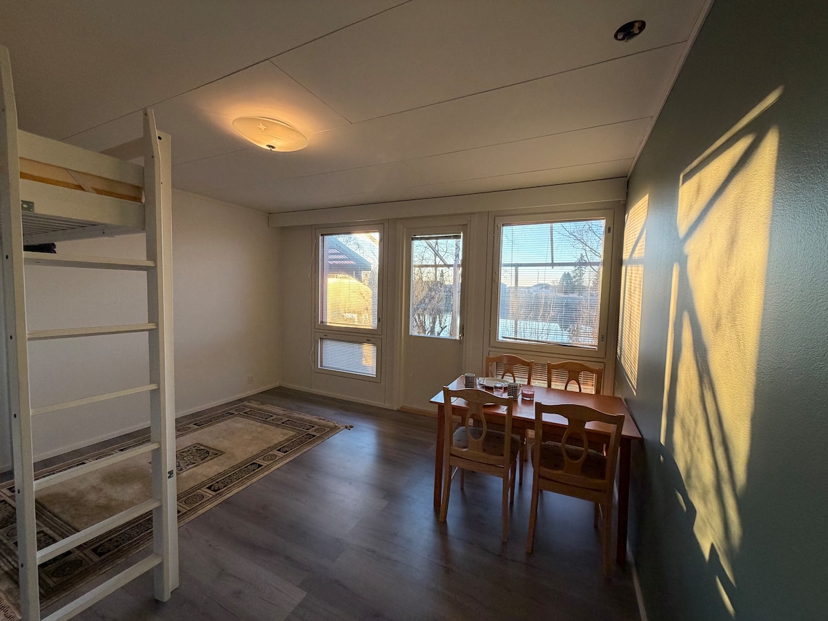 Enjoy a cozy stay in a compact 45 m² apartment on the second floor in the center of Seinäjoki. The train station is only 500 meters away and the nearest grocery store is 350 meters away. Bed linen and towels are always waiting for you and are included in the rent. There are six beds: a double bed, a sofa bed and a wide air mattress. The apartment has a cooling machine and blackout curtains in the bedroom. In addition, you have free parking for one car.