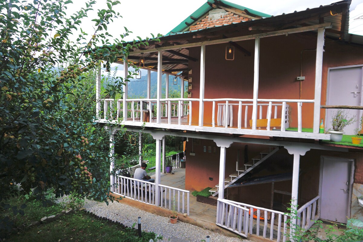 A true-blue working Apple orchard, barely 400 meters from the iconic & world-famous NAGGAR CASTLE, in a quaint little village called Chanalti. It is a rustic village set-up but fitted with all modern-day comforts - along with unending cups of herbal tea, coffee & stories to share! It is a place where the air is always fresh, the views are always stunning, and our hospitality is always homely, warm and welcoming! Min 2 Night Stay required! Pls. DO NOT book for 1 Night. STAGS NOT ALLOWED 🚫