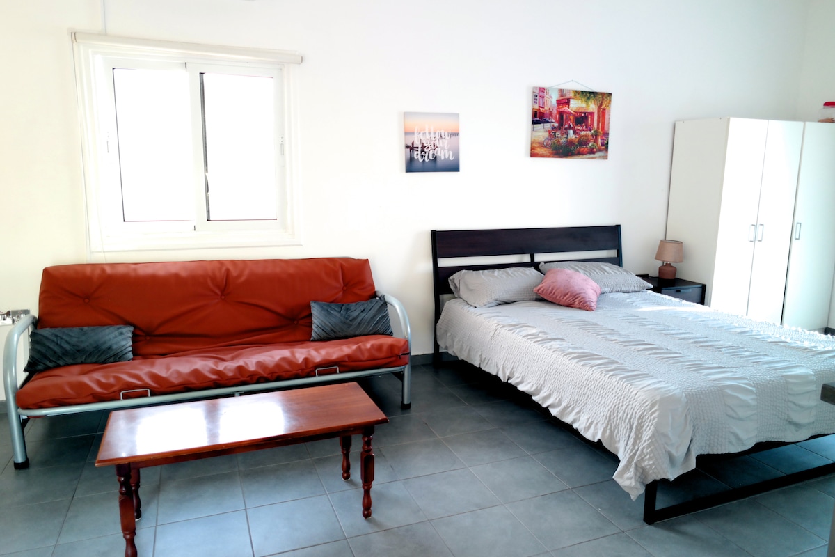 Kick back and relax in this calm, stylish space. Our sunny studio oasis is perfectly located in a quiet residential building in central Larnaca. Enjoy easy access to the Metropolis Mall and the beautiful Larnaca Finikoudes beach, just a 5 minute drive away. The airport is conveniently situated a short 12-minute drive from your doorstep. Our apartment is an ideal base for exploring all that Larnaca offers, with easy access to highways connecting you to Nicosia, Limassol, and Ayia Napa.