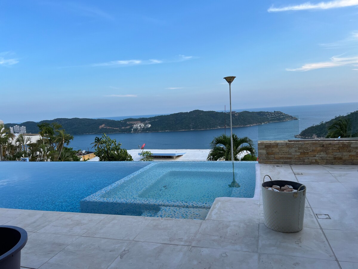 Villa redesigned in 2024, located in Brisas del Marqués, 24/7 security, impeccable maintenance, stunning ocean views. Fully equipped. 4 bedrooms, 4.5 bathrooms. Privacy, a palapa with a lounge area, and a bar. 2 dining rooms Private pool Parks up to 4 cars Staff included: Daily cleaning. 1 cook, except on check-out day. Powerful internet, 500 megabytes. Privileged location, 5 minutes to restaurants, 10 minutes to the beach.