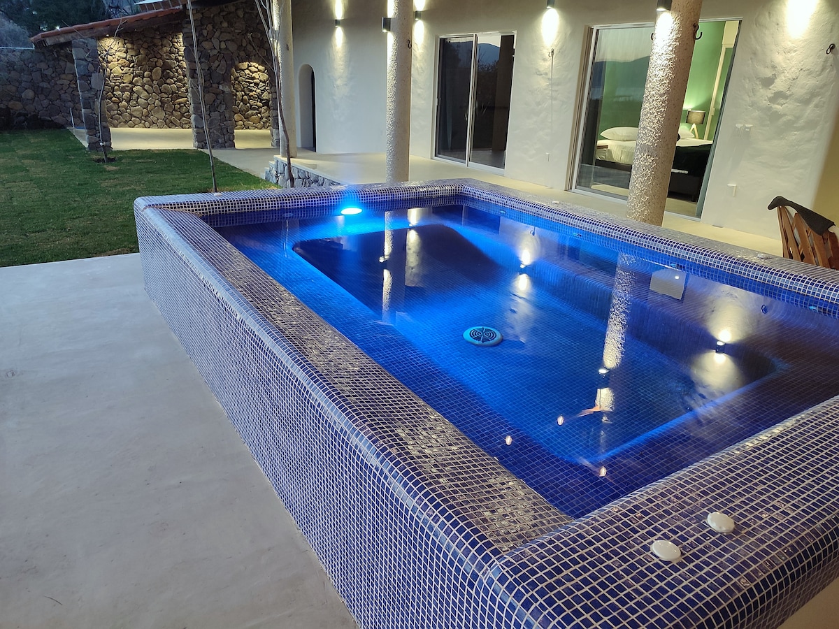 Bienvenido a nuestra relajante casa de campo. Puedes preguntar por hospedar más huéspedes Casa - 1 baño completo - 1 cuarto con 2 camas matrimoniales -Sala, comedor y 1 sofacama Terraza: - 2 baños medios para visitas - La alberca climatizada por paneles solares y bomba de calor - Terraza amplia con cocina y barra, banca amplia para 12 personas, 20 sillas y 3 mesas, da vista directa a la alberca. Estacionamiento techado 3 carros o terraza para 4 mesas con 10 sillas cu. Asador disponible