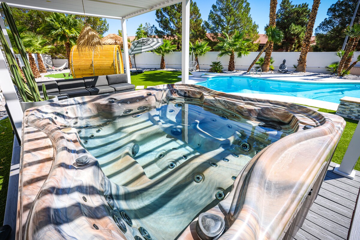 Experience a rare blend of luxury space, location in the heart of Las Vegas . Stunning 4000+ sq ft home just 8 minutes to the strip , with free heated 10 person hot tub! Parties ,events are allowed. Pool table, work space, fitness,meditation area, outdoor game, and relaxing sunroom with massage chair , swing setting . Close to Allegiant Stadium, Chinatown, convention center. Many restaurants within walking distance. . Early check in,early luggage storage.and Disabilities access are available.