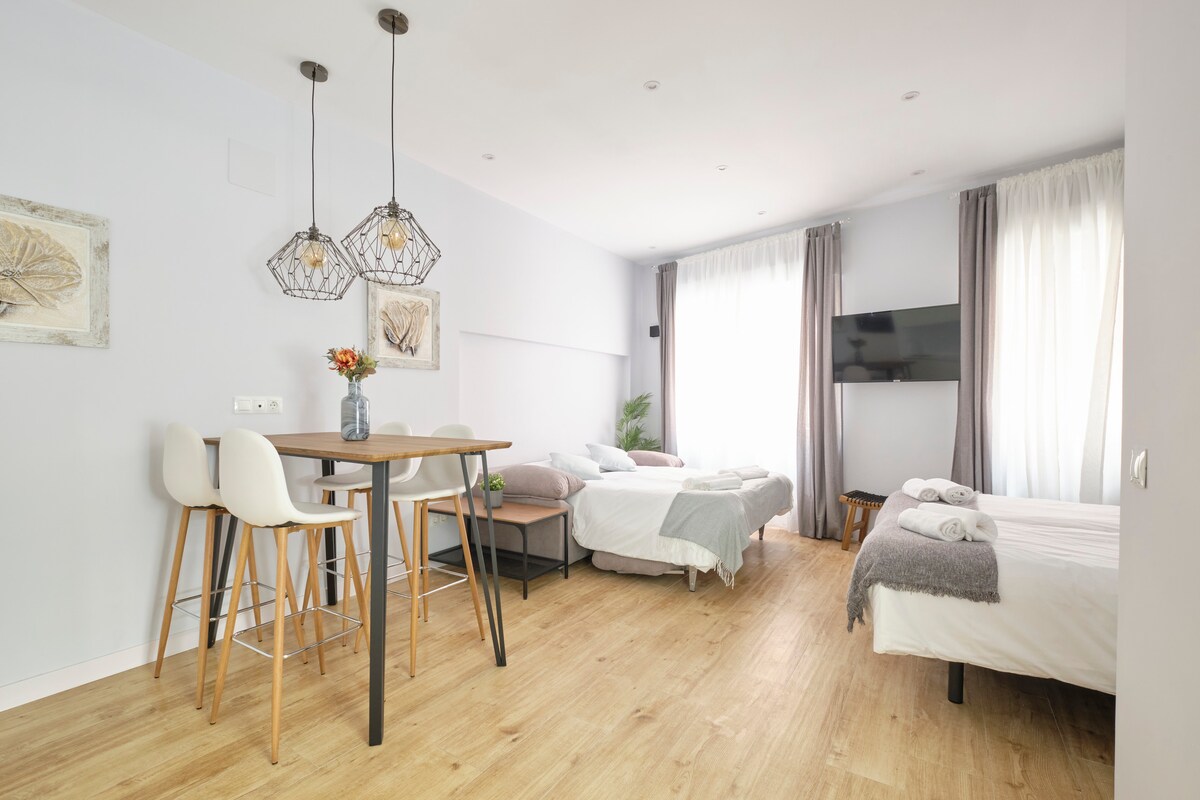 Cosy and bright studio in the centre and historic centre of Madrid It has WiFi (high speed), Air Conditioning, underfloor heating, SmartTV and Netflix, Kitchen, Fridge, Microwave, Hairdryer, Toaster, Coffee Maker Located 300 mts. from Embajadores and La Latina metro stations and 15 minutes walk from "Plaza Mayor", "Puerta del Sol" and "Gran Vía" 35 minutes by bus from the Santiago Bernabeu Stadium Terraces, cafes, theatres, museums within walking distance. Sundays next to the "Rastro" market