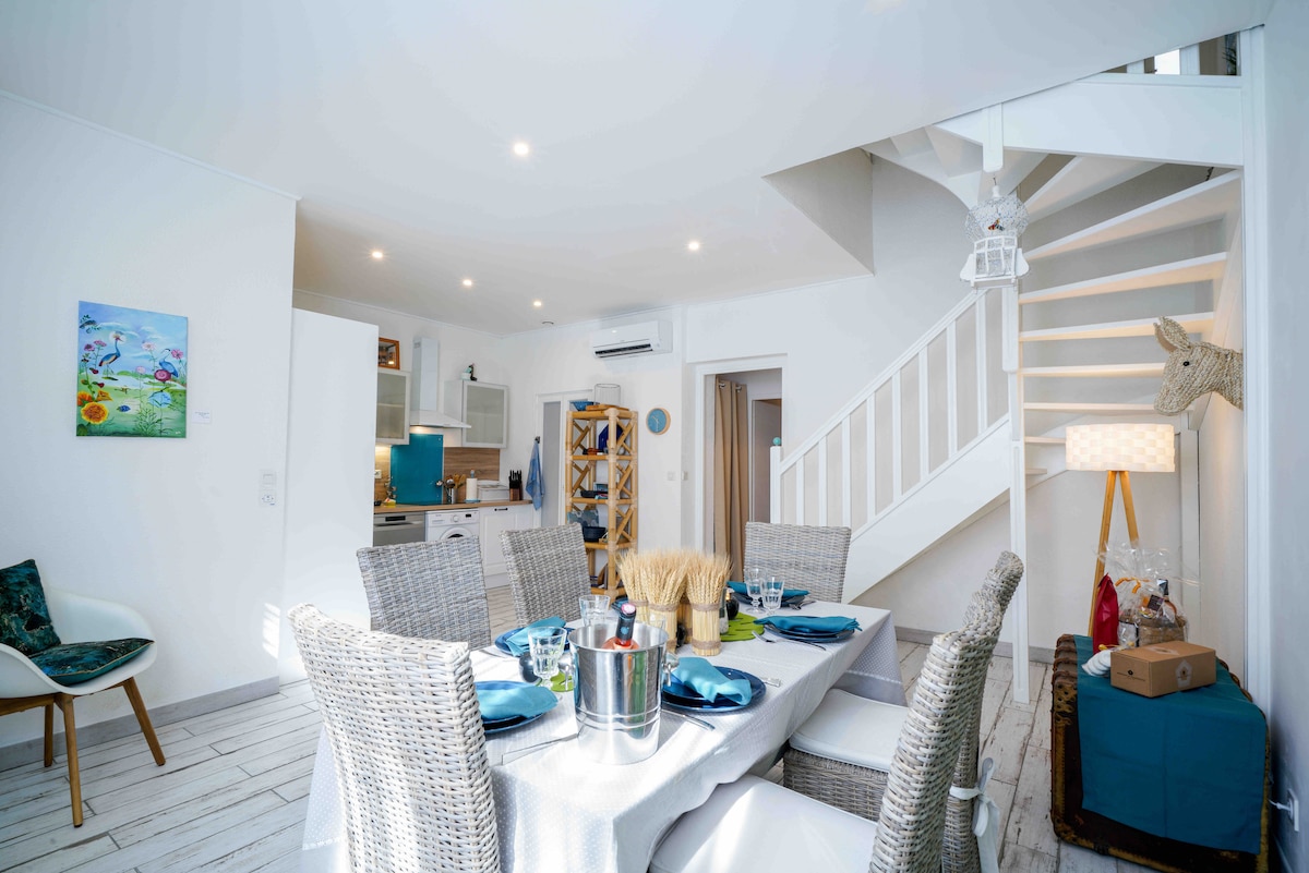 House near the port located in a residence with free private parking. Accommodation with 20 m2 courtyard, 2 bedrooms with storage, including one on the mezzanine, 1 equipped kitchen (dishwasher, washing machine, microwave, etc.), 1 bathroom with shower and toilet. Air conditioning, plancha, garden furniture, TVs... Shops within walking distance. Located a 2-min walk to the port and about a 15-min walk to the beach (5 min by bike) Cleaning to be done, linens and towels not provided. Deposit check required