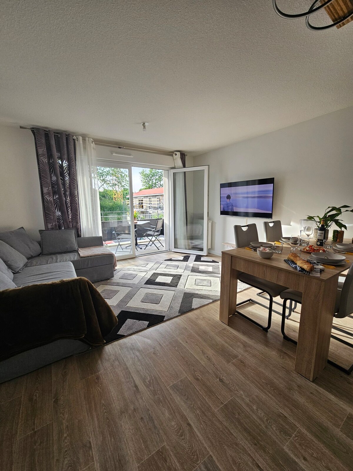 **Charming Bright Apartment in Le Barp – Close to Bordeaux and Arcachon** Spacious 47 m² apartment in Le Barp, 30 minutes from Bordeaux and 25 minutes from Arcachon and the Dune du Pyla. Quiet and relaxing setting, perfect for a getaway. **Location:** - 2 km from a supermarket. - 100 m from the city center, close to all amenities: bakeries, pharmacy, etc. **Amenities:** - Bedroom with double bed (160 x 200). - Living room with sofa bed. - Furnished kitchen. - Washing machine.