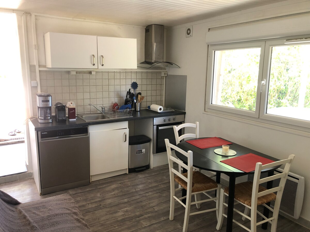 In the heart of the Bandol vineyard, 10 minutes from the beaches of Bandol or Lecques. Independent studio, air-conditioned, quiet in the countryside. Main room of 32 m2 with 2 sofas and mezzanine of 5 m2 (160 bed). Office area, Wi-Fi internet access. Fully equipped kitchen, TV and shower room with toilet as well as a dressing room. The 22 m2 terrace with pergola equipped for meals with gas BBQ. Free access to a washing machine. Parking and private outdoor access for your vehicle.