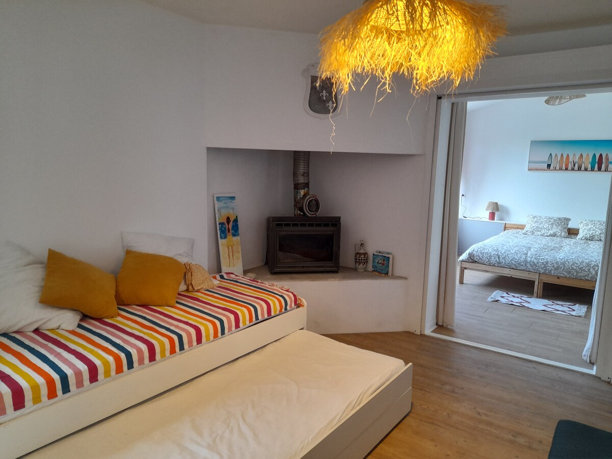 Authentic small Oléronaise house (35 m2) completely renovated located on our property, very quiet in the historic village of Saint-Georges. Separate entrance, bike garage, private terrace and garden. The most beautiful beaches of the island are less than 2 km away, close to bike paths, shops and restaurants nearby (200 m), daily market in season. Bed made on arrival, towels and linens provided. Wood-burning stove, wood available. Two bikes available.