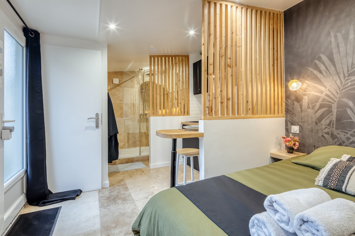 Within a private property, 25 m2 studio with SDD, equipped kitchen, a double bed and a nice little green area with covered and lit terrace. It will bring you peace and privacy. Located in the quiet and safe Jardin des Plantes neighborhood. You can park for free in front of the property, no parking fees to be expected in addition to the rental, rare in Rouen Close to all shops: 3-minute walk to the studio. Close to public transport: 3-minute walk.
