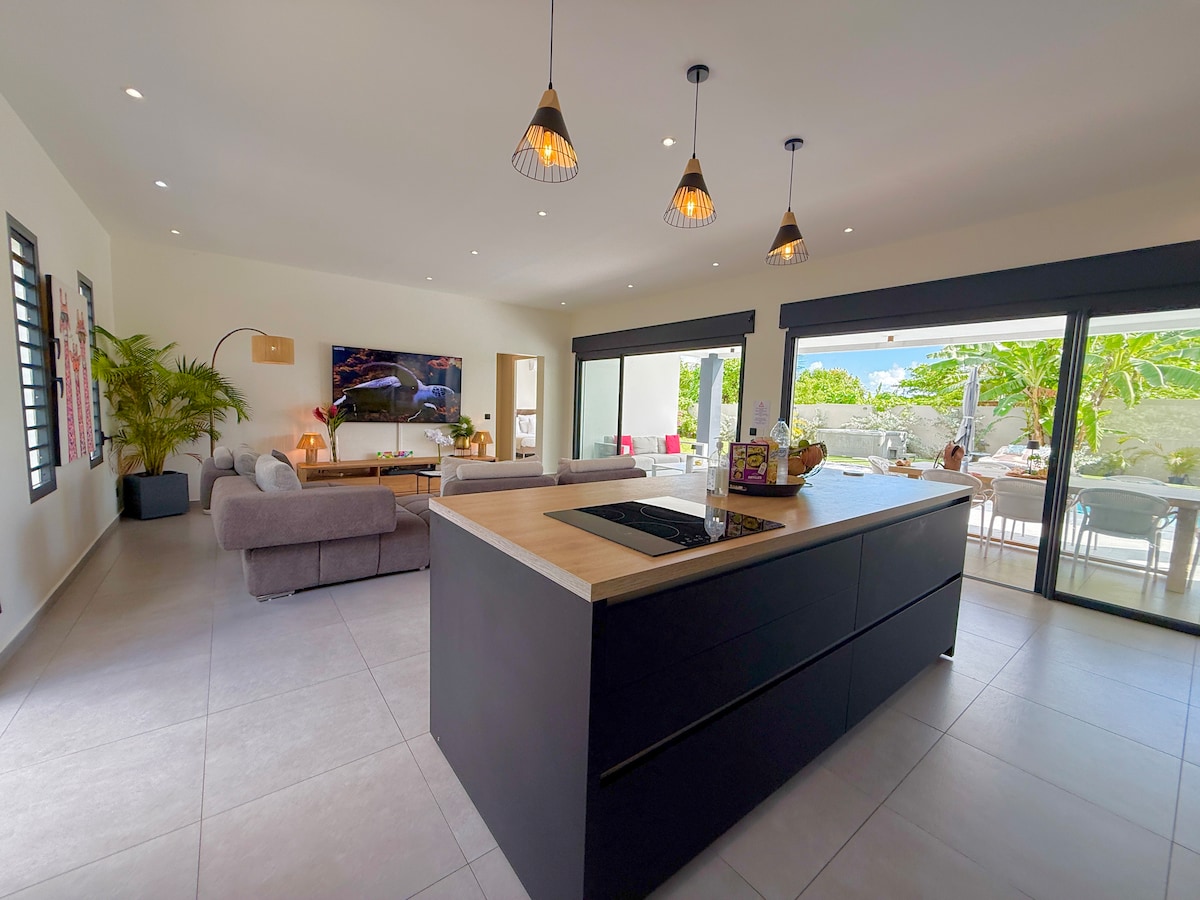 Pleasant architectural villa located in a very quiet area where silence reigns. This villa is equipped to guarantee your comfort and serenity throughout your stay. It is ideal for rest, relaxation in the sun and moments of conviviality for families or groups of friends. Open to the outside, it is exposed to the trade winds so very ventilated. It has the essential large-capacity drinking water supply. It's an exceptional value for money product.