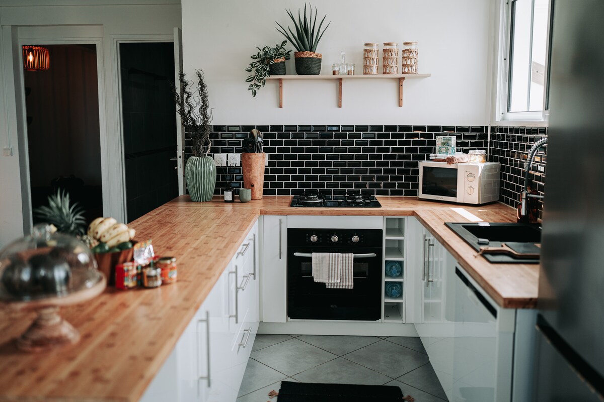 Colourful and bright house, perfect for an exotic stay. Dynamic bright yellow living-dining room with open fitted kitchen (fridge, oven, microwave, hobs, dishes). Sofa bed + TV. Two air-conditioned bedrooms: a green one with comfortable double bed, a blue one, storage and blackout curtains. Modern bathroom: walk-in shower, toilet, washing machine. Large covered terrace with barbecue and outdoor seating area. WiFi, air conditioning. Close to beaches (5-10 min by car)