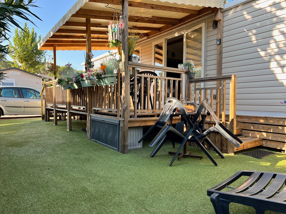 Escape to the upscale Parc Montana campsite! Relax in the Mediterranean sun and enjoy the 3 swimming pools, including 1 heated. Water slides, Jacuzzi, multi-sports park and family entertainment. Close to beaches and must-see sights, Everything is included: Cleaning, WiFi, VOD movies, Air-conditioning, bikes! Large terrace that closes, very convenient for your dog or children. Unforgettable stay guaranteed! Rental / sheets towels managed by the campsite reception