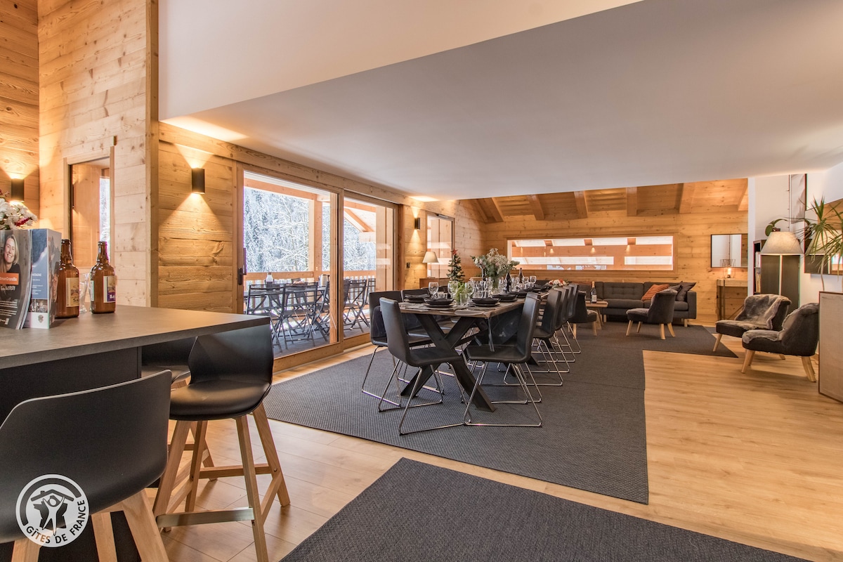 Large panoramic chalet (190 m2) facing Mont Blanc and close to a swimming lake. Rated 4 stars. 4 spacious bedrooms (bedding in 3*160 cm and 2*90 cm). 3 bathrooms, 2 with large Italian shower and 1 with bathtub. Traditional sauna with panoramic view through its giant porthole, a real moment of relaxation and recovery after exercise! Home Cinema - BONZINI Foosball - CABASSE Speaker - Gas Grill etc...