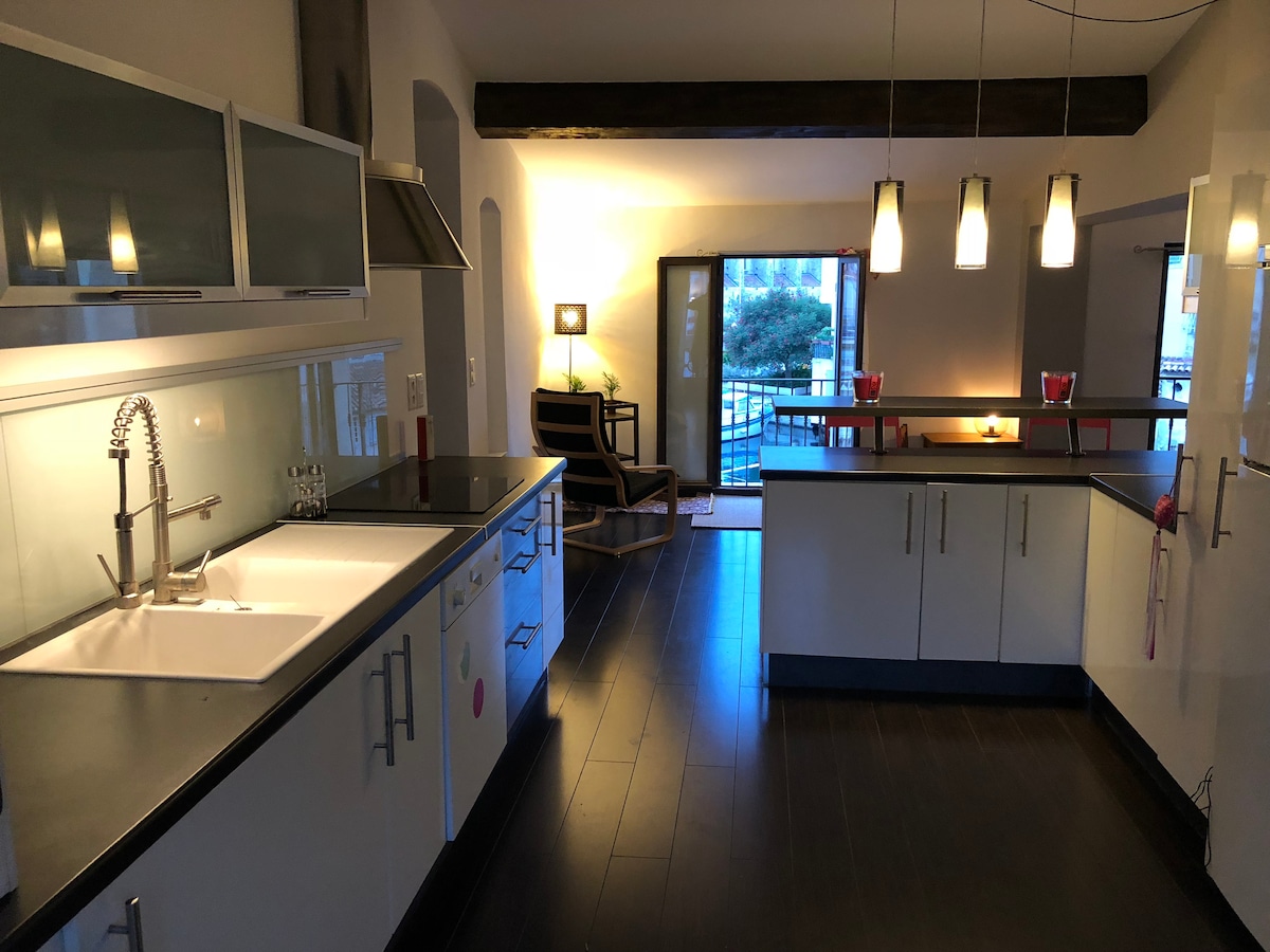 85 m2 duplex apartment, contemporary design decor, on the Miroir aux Oiseaux in the heart of PROVENCE. Atypical apartment, living room with open kitchen of 65 m2, sitting area, dining room, cozy corner for a little relaxation or reading facing the birdbath, under the roofs in a village house. 200 m from Martigues beach and its huts. Cozy place with magnificent views of the birdbath and Place Mirabeau with its small balcony. Fiber internet + 192 chains