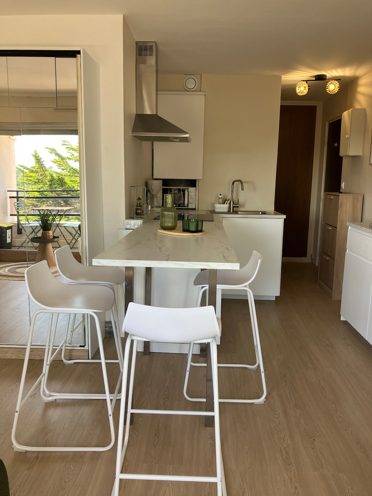 Studio de 35 m2 rénové, résidence agréable, accès direct à la plage. Terrasse face mer de 15 m2, ensoleillement dès l'après-midi et vue exceptionnelle sur la plage et le coucher de soleil ! Place de parking privative TV, internet fibre SDB et cuisine équipées Draps et serviettes fournis Idéal jusqu'à 4 personnes Literie neuve Pas d'animaux