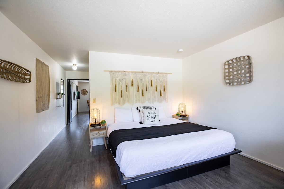 A charming, one-of-a-kind place. The Wanderlust is a boutique motel with individual private suites. Self check-in/check-out with your own private outdoor entrance. Includes: 2 Queen beds, 1 Custom Bunk (best for guests 5'0" & under), Mini Fridge, Keurig w/coffee, Smart TV, Door keypads. We are Pet Friendly! There is a $25 FEE per PET - Undisclosed pets charged $250.00 PARKING-Your ONE included parking space is in the main parking lot There is a $25.00 fee for additional Vehicles.