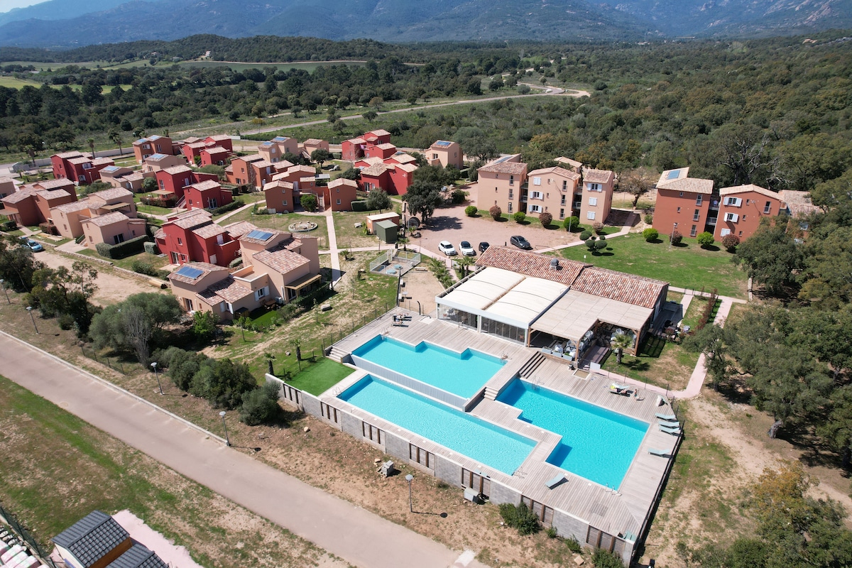 Relaxation assured about 500 meters from one of the most beautiful beaches in Corsica, in the Gulf of Porto-Vecchio. The heated pool is available from June to September. Optional breakfast from mid-May to mid-October. On the beach you will find a sailing club, restaurants and sunbeds for rent, a snack and a 5* hotel with a wonderful SPA. And just as close, tennis and shops. Viva la Vida!