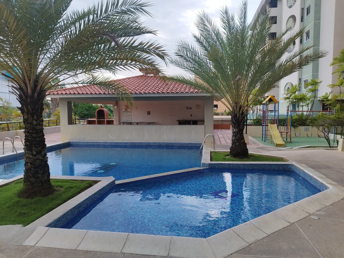 This elegant and spacious accommodation is ideal for group trips of up to 10 people (8 adults and 2 children), as a couple or alone. Whether you come to enjoy the tranquility for vacations, work, medical appointments or just rest, it has beautiful green spaces, swimming pools for adults and children, barbecue area, courts and very close to the beach, 5 minutes away. It is close to everything: grocery stores, shopping malls, bakeries, supermarkets, restaurants, music venues, pharmacies, and stores