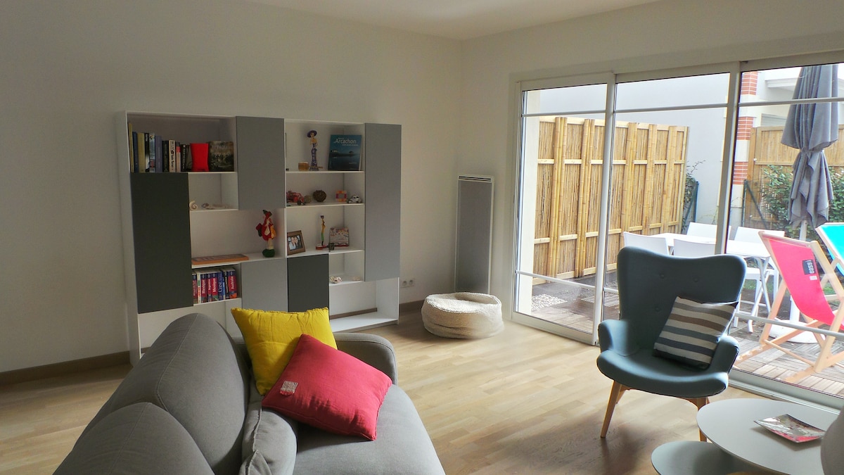 Newly renovated and ideal for your vacation or weekend, apartment with enclosed garden, covered terrace, secure private parking. 900 m from the Arcachon basin (Saint Brice), 1.5 km from the city center, the oyster port, shops and Andernos les Bains. Bicycle path 30 m away, bicycles 10 m away, "Le Pitey" restaurant 10 m away and fitness trail 3 min away. Mérignac (airport) 40 min Air conditioning, equipped kitchen, oven, glass cooktop, dishwasher, washing machine, Nespresso coffee machine, wifi, motorized shutters.
